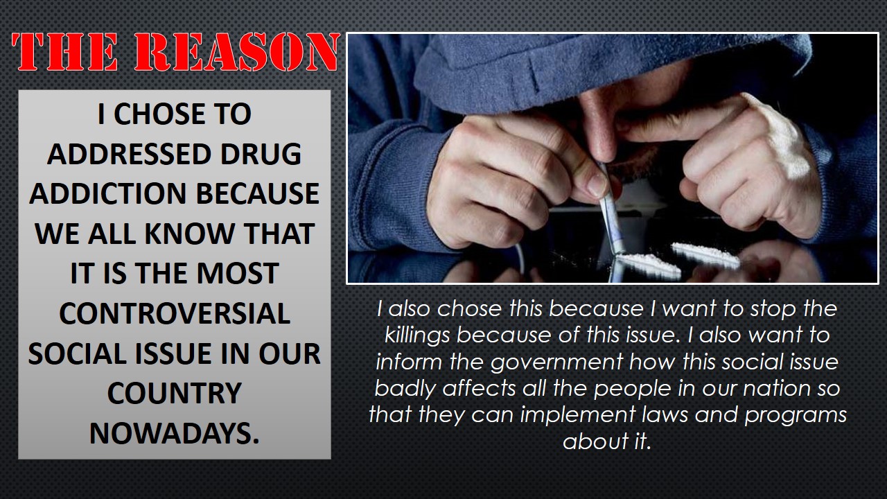 The main reasons why this social issue, online game addiction, still exist on our society is because, people find online games as a thing that they must try to be in line with the social trends. Second, because the internet has become more and more advance and modern that it creates new features that the people became obsessed with playing online games. And lastly, it is because of the people around them that influenced their behavior towards using it.