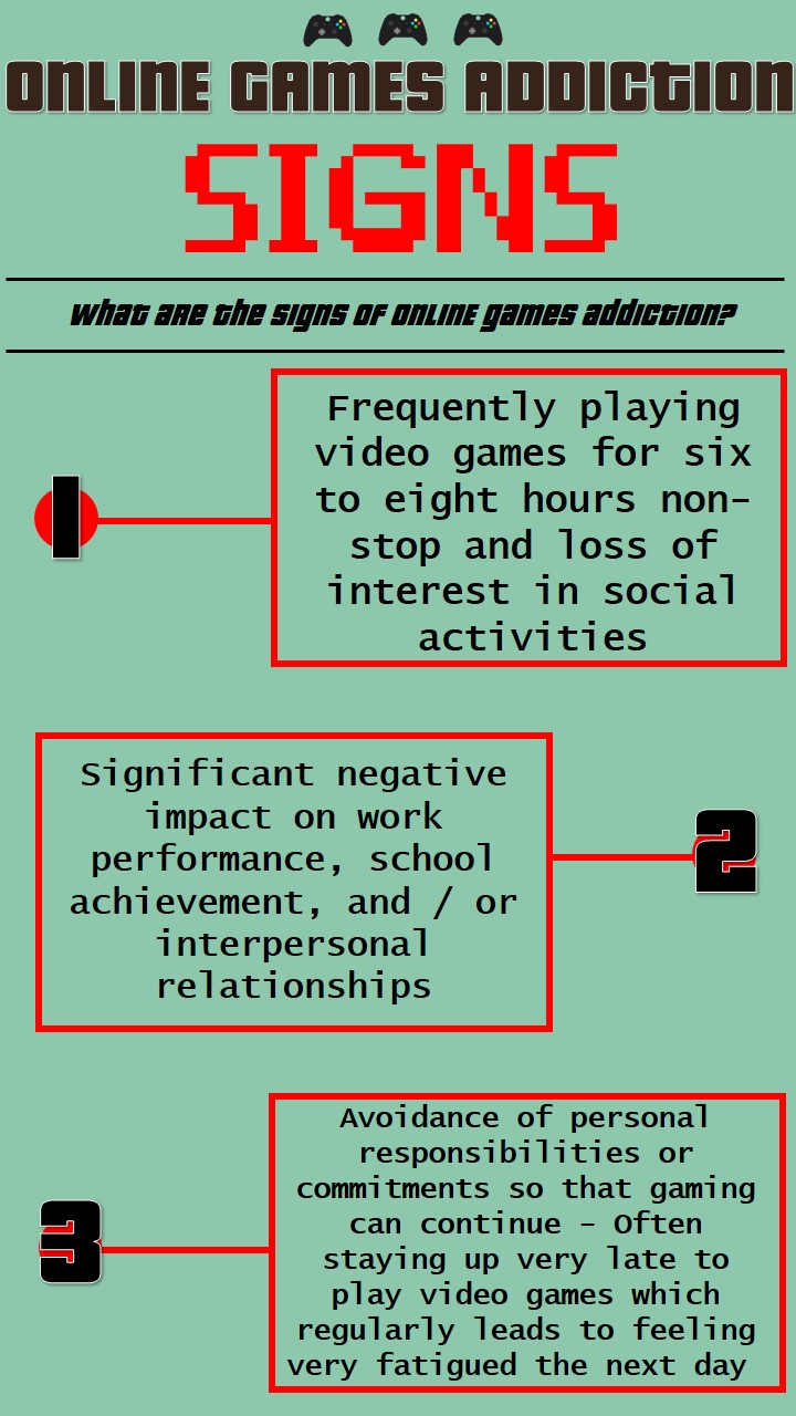 Nowadays, playing online games excessively leads to negative consequences for an individual. There are times when an online game addict sacrifice his work, his time for learning, hobbies, socializing with real people, time with his family, friends and loved ones and even his time to sleep and eat. These negative consequences are the causes of an individual to isolate himself to the people around him, online games addiction can lead to decreased on his academic achievement and worst is that those individuals could experience health issues such as body pains and sleep abnormalities. Those individuals ignores more important responsibilities and often obsessed with obtaining higher rankings and achievements in their favorite online game.